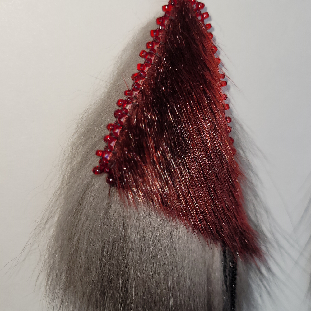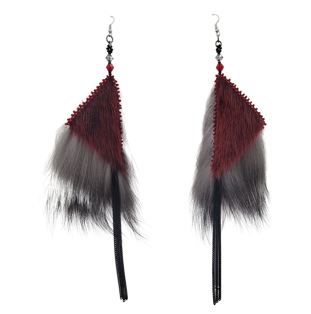 Boucles d’oreilles triangles en peau de phoque rouge frappante, accompagnée de fourrure renard argenté et de bordures de perles rouges avec pendentifs en chaînes gourmettes noires. Parfait pour une soirée lorsque vous avez besoin d’un petit quelque chose de plus, ou d’un look audacieux au quotidien! Excellentes pour faire tourner les têtes, ces boucles sont belles, légères et sûrs de faire une déclaration! Une superbe combinaison de peau de phoque, de fourrure de renard et de la brillance du Swarovski.