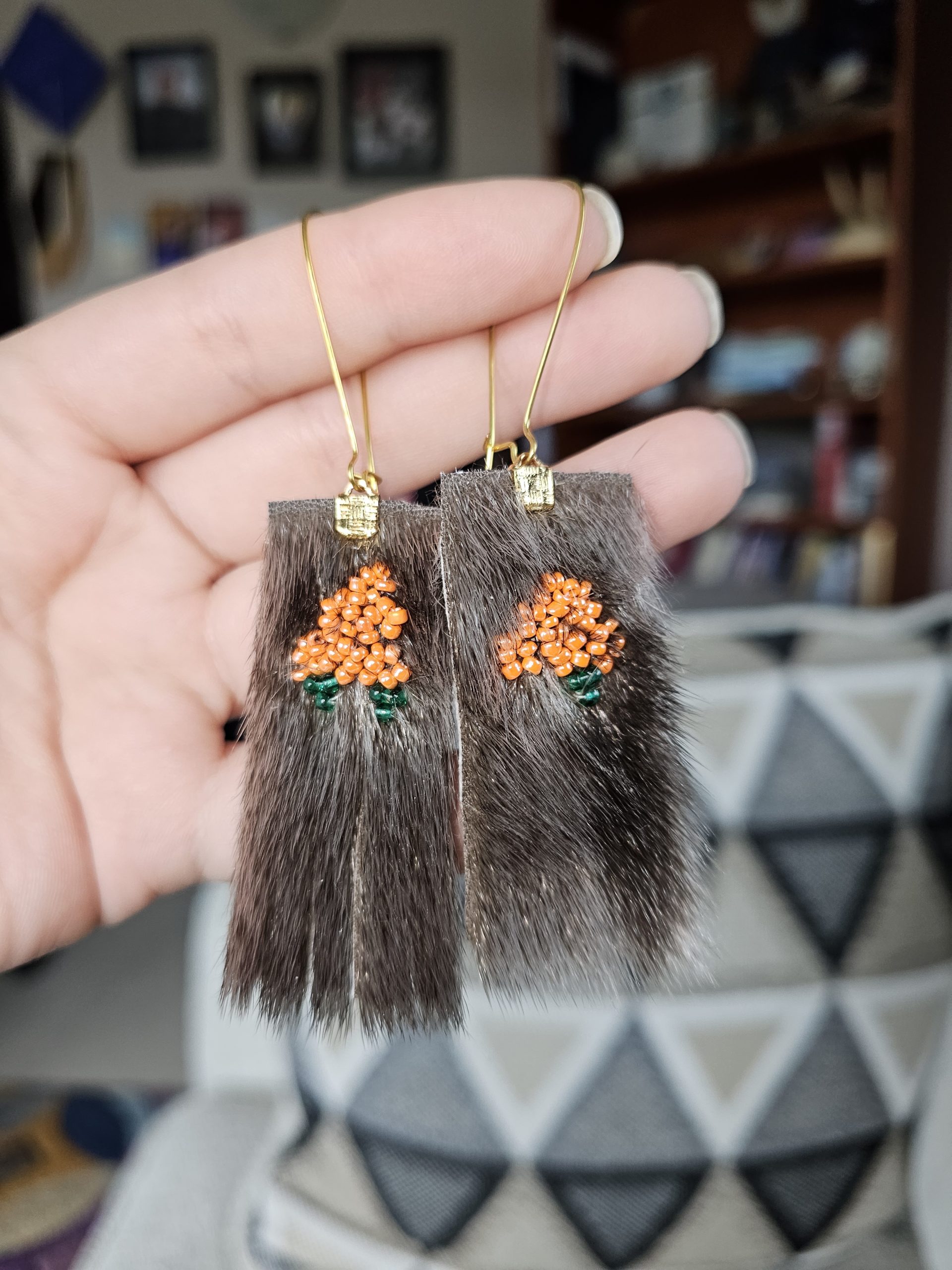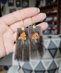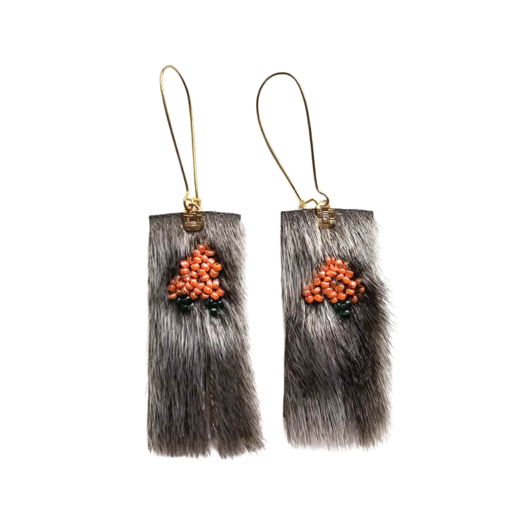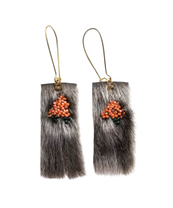 Découvrez les boucles d’oreilles en peau de phoque à franges et akpi brodé, un superbe hommage aux baies mûres de la toundra et à la saison de la cueillette. Combinant un ouvrage de perles complexe et des franges en peau de phoque élégantes, toute la nature de l’Arctique est incarnée dans ces merveilleux bijoux.