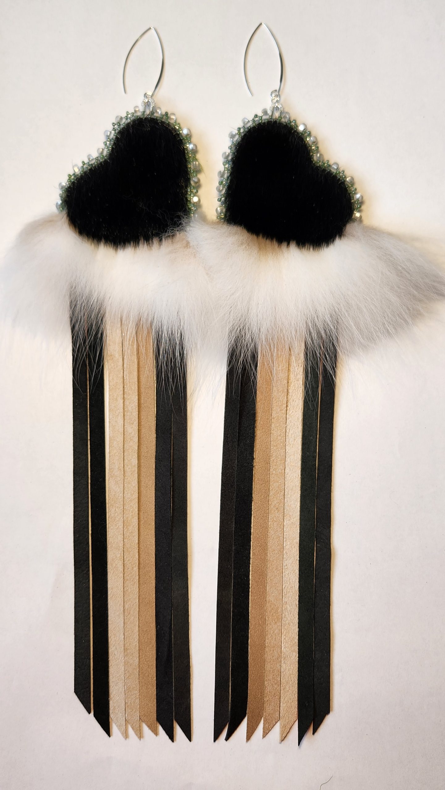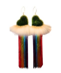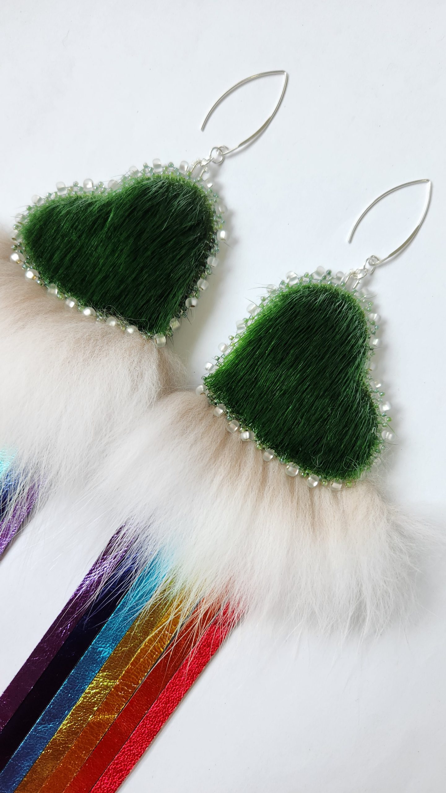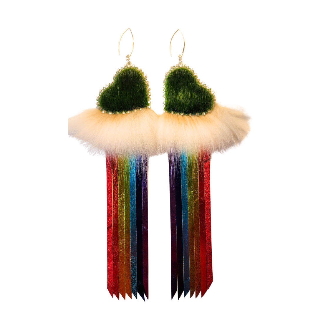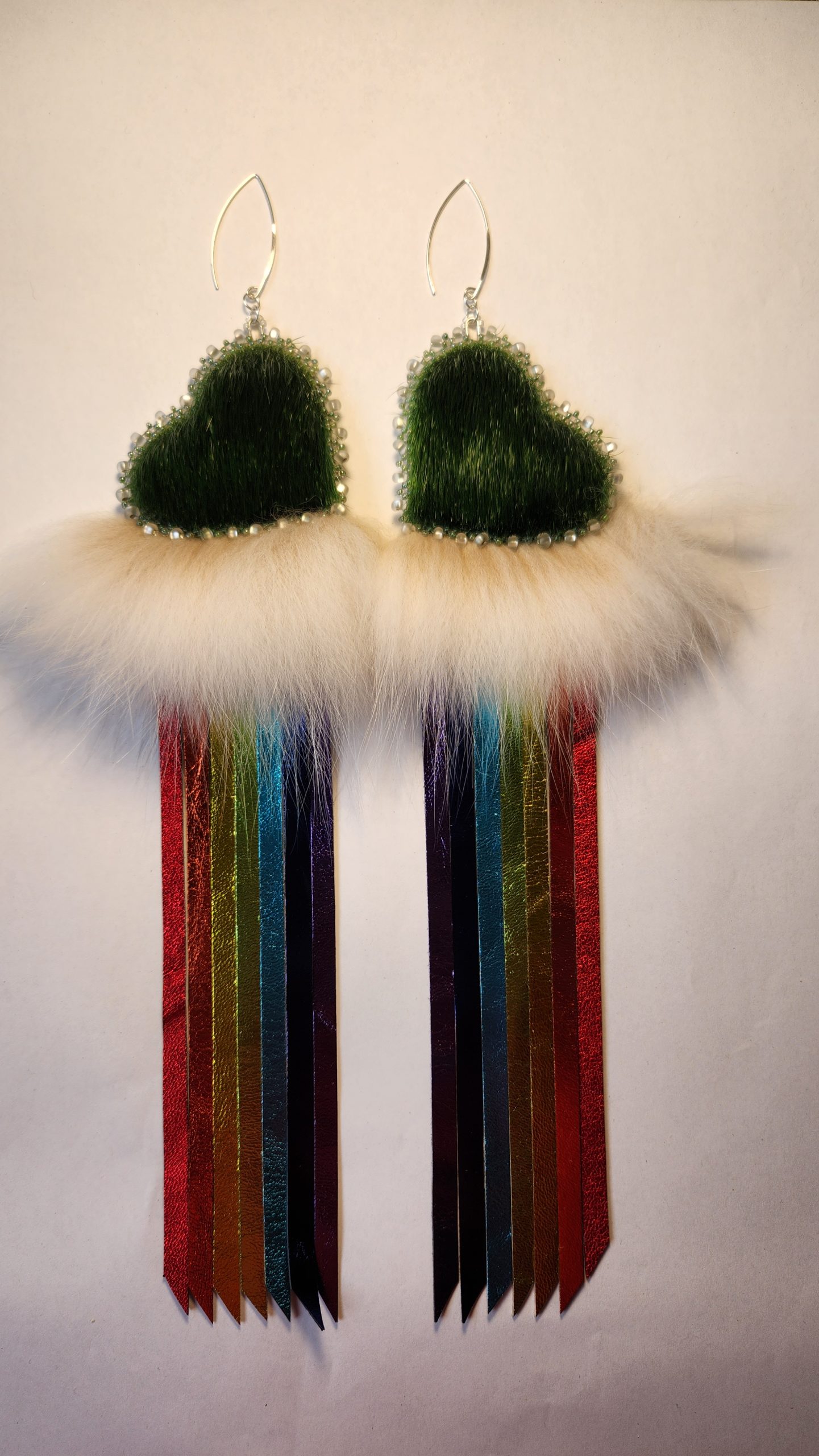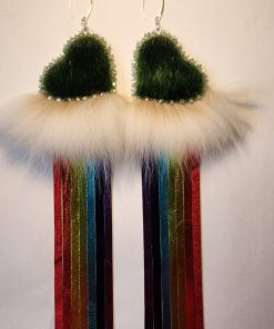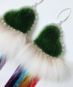 Découvrez ces superbes boucles d’oreilles à franges arc-en-ciel et cœur en peau de phoque d’un vert éclatant. Avec leurs deux faces en peau de phoque, les cœurs constituent l’élément phare de ces boucles d’oreilles, qui présentent des franges éclatantes aux couleurs de l’arc-en-ciel fabriquées en cuir d’agneau métallique et fixées aux cœurs, dévoilant ainsi une fascinante cascade de couleurs. De la fourrure de renard polaire a été délicatement ajoutée entre les franges arc-en-ciel et les cœurs pour former un nuage duveteux. Procurez-vous une paire et démarquez-vous grâce à ces superbes boucles d’oreilles légères aux couleurs de l’arc-en-ciel.