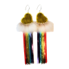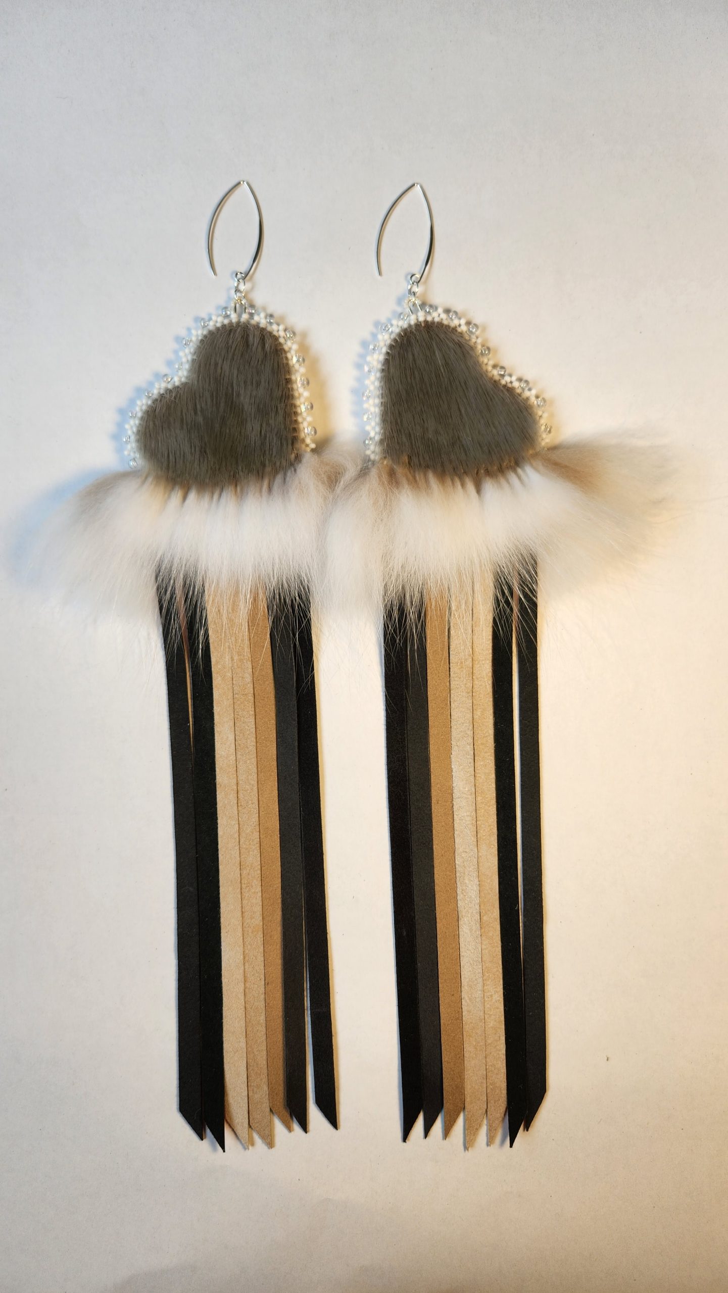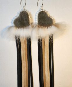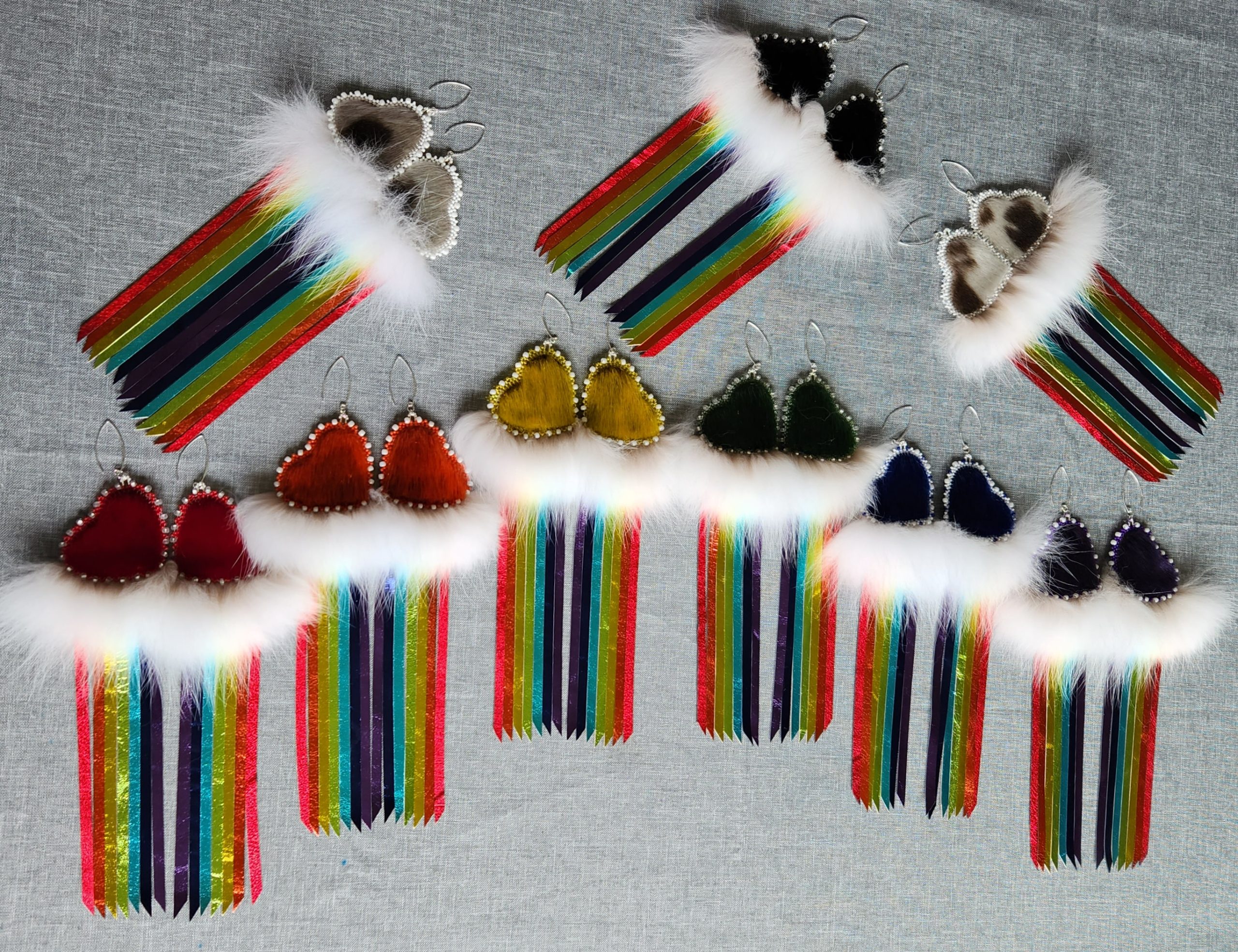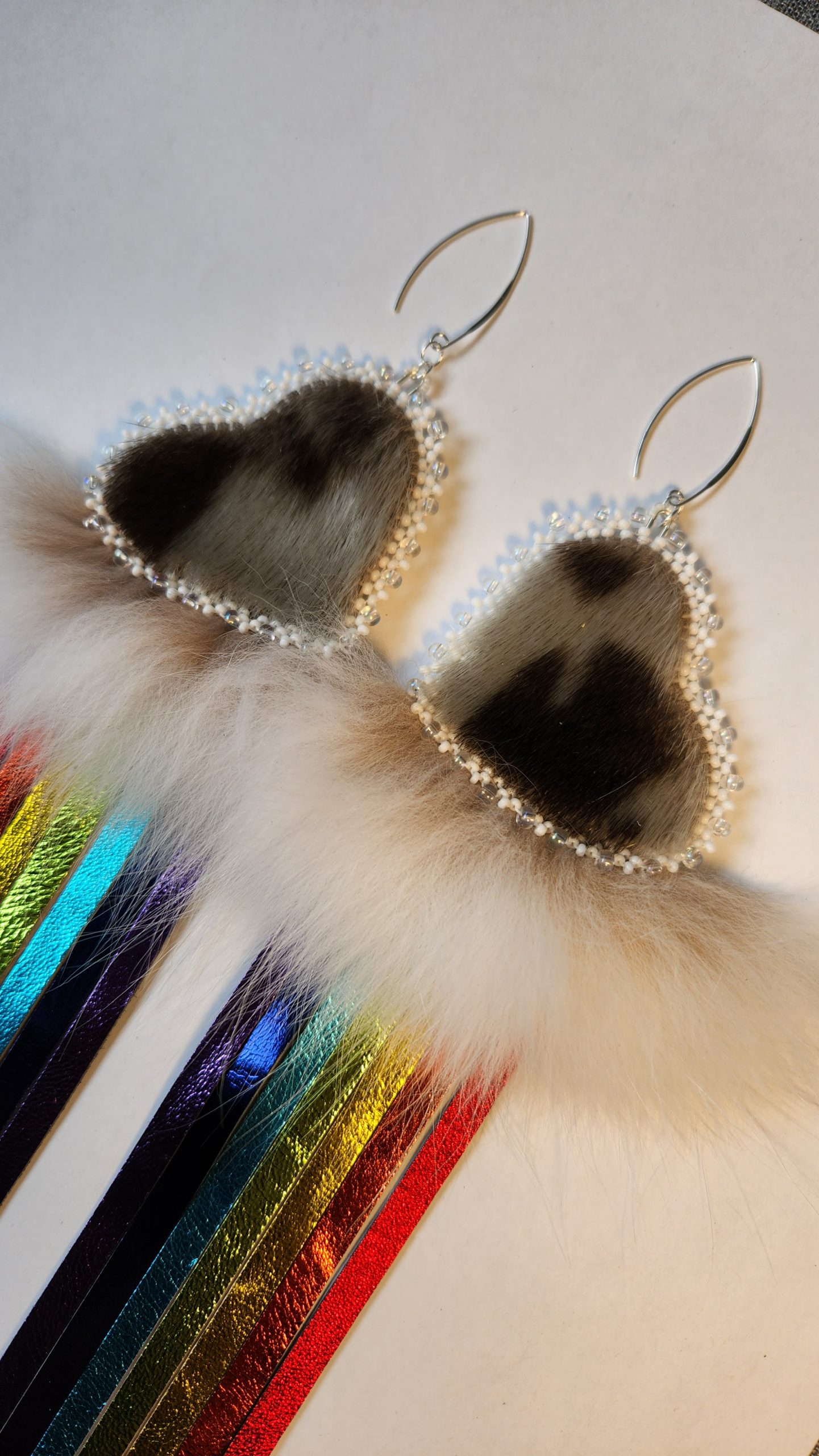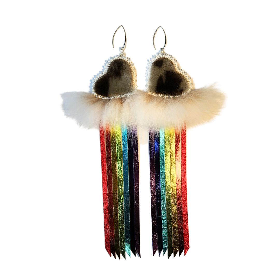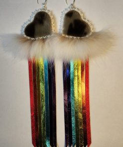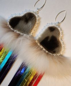 Découvrez ces superbes boucles d’oreilles à franges arc-en-ciel et cœur en peau de phoque. Avec leurs deux faces en peau de phoque, les cœurs constituent l’élément phare de ces boucles d’oreilles, qui présentent des franges éclatantes aux couleurs de l’arc-en-ciel fabriquées en cuir d’agneau métallique et fixées aux cœurs, dévoilant ainsi une fascinante cascade de couleurs. De la fourrure de renard polaire a été délicatement ajoutée entre les franges arc-en-ciel et les cœurs pour former un nuage duveteux. Procurez-vous une paire et démarquez-vous grâce à ces superbes boucles d’oreilles légères aux couleurs de l’arc-en-ciel.