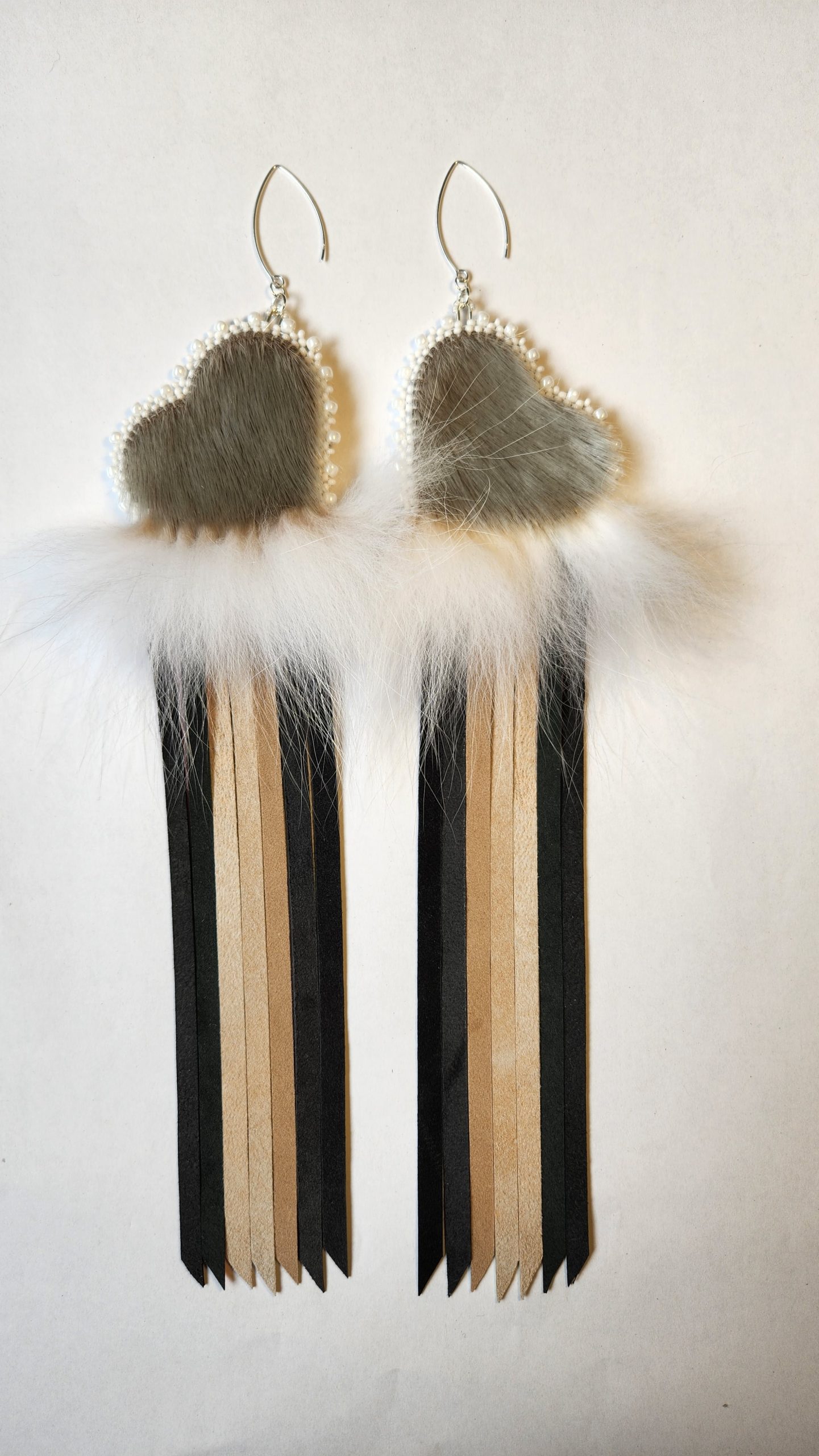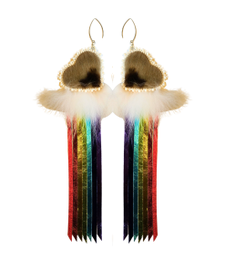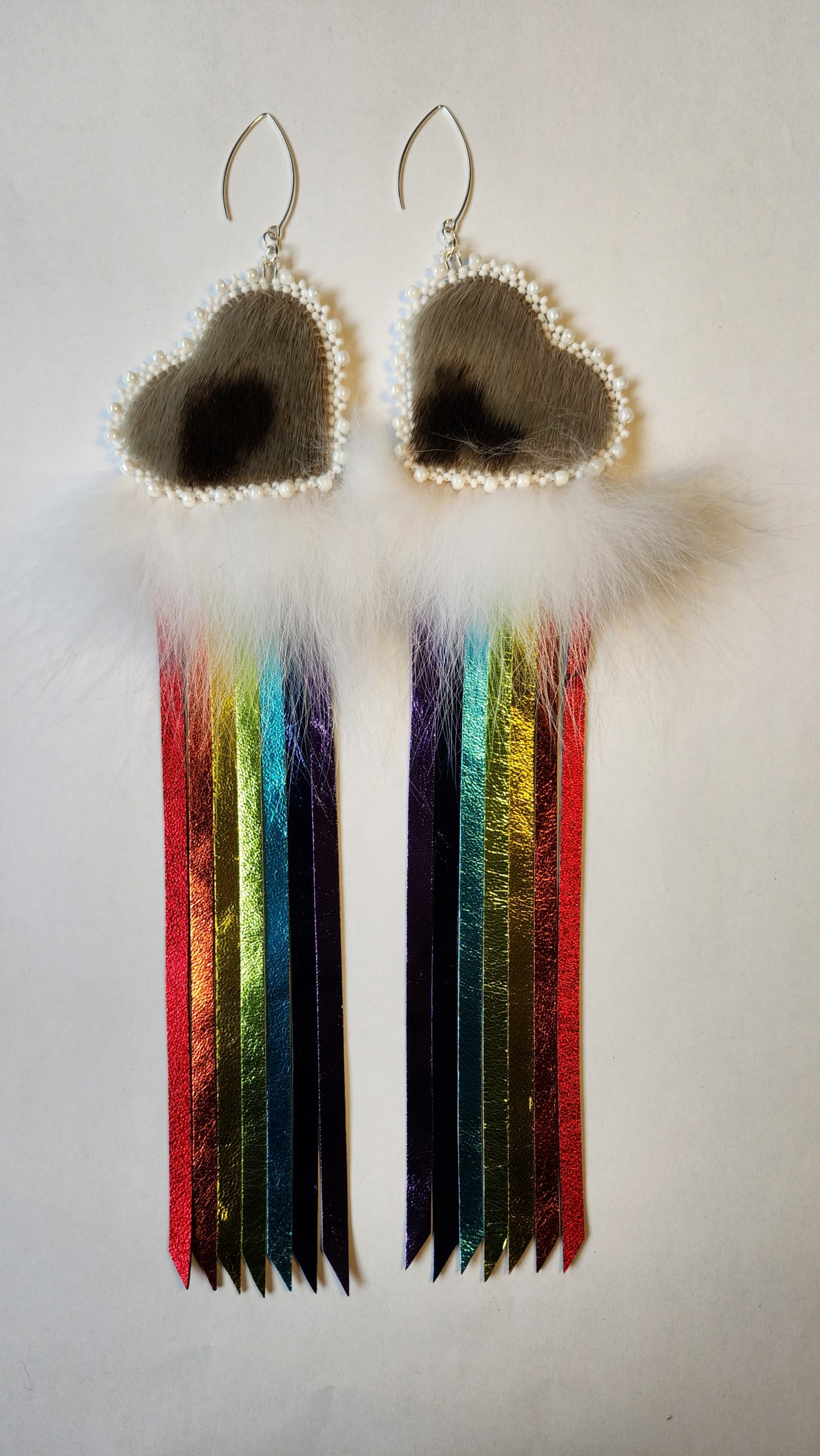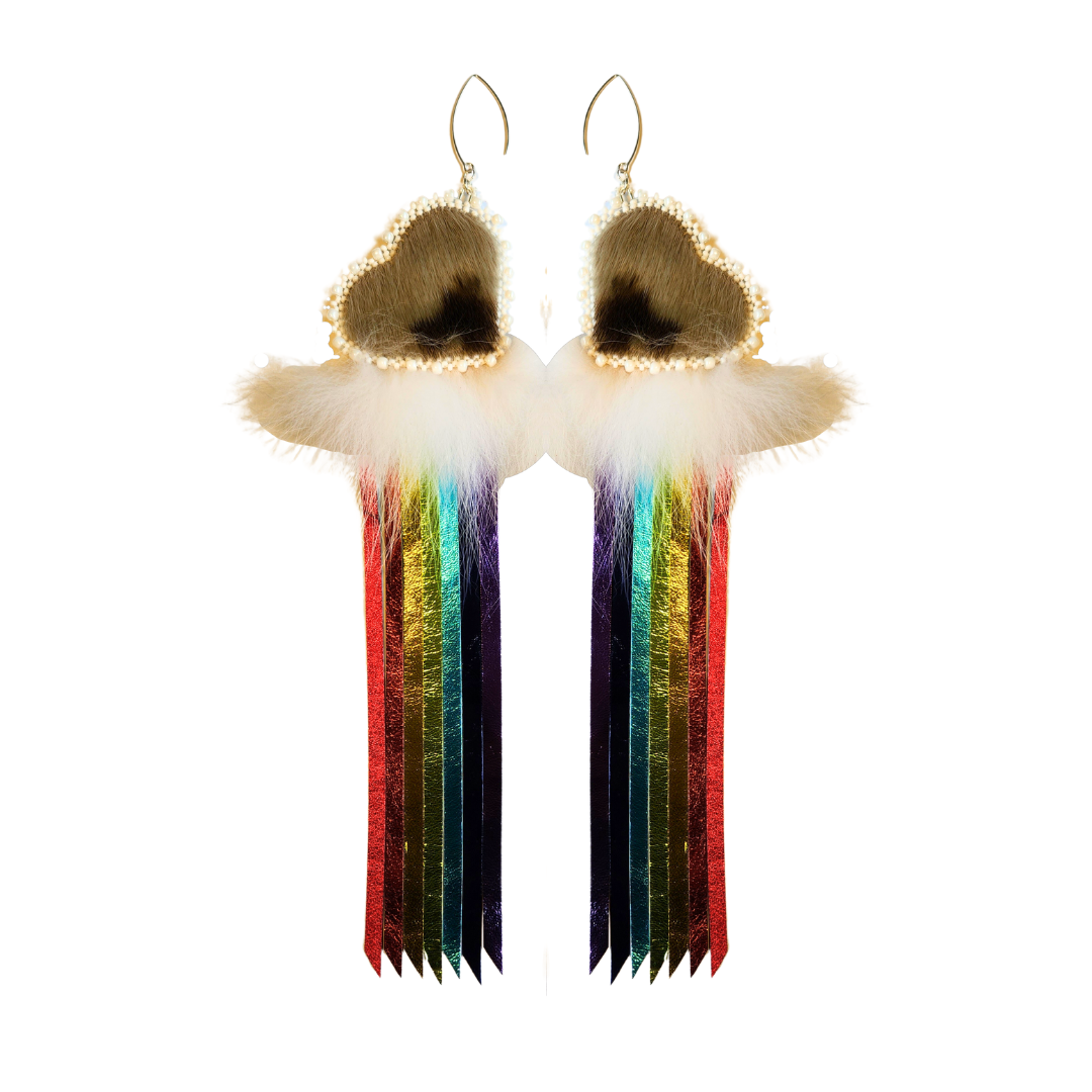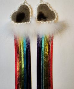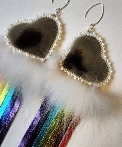 Découvrez ces superbes boucles d’oreilles à franges arc-en-ciel et cœur en peau de phoque. Avec leurs deux faces en peau de phoque, les cœurs constituent l’élément phare de ces boucles d’oreilles, qui présentent des franges éclatantes aux couleurs de l’arc-en-ciel fabriquées en cuir d’agneau métallique et fixées aux cœurs, dévoilant ainsi une fascinante cascade de couleurs. De la fourrure de renard polaire a été délicatement ajoutée entre les franges arc-en-ciel et les cœurs pour former un nuage duveteux. Procurez-vous une paire et démarquez-vous grâce à ces superbes boucles d’oreilles légères aux couleurs de l’arc-en-ciel.