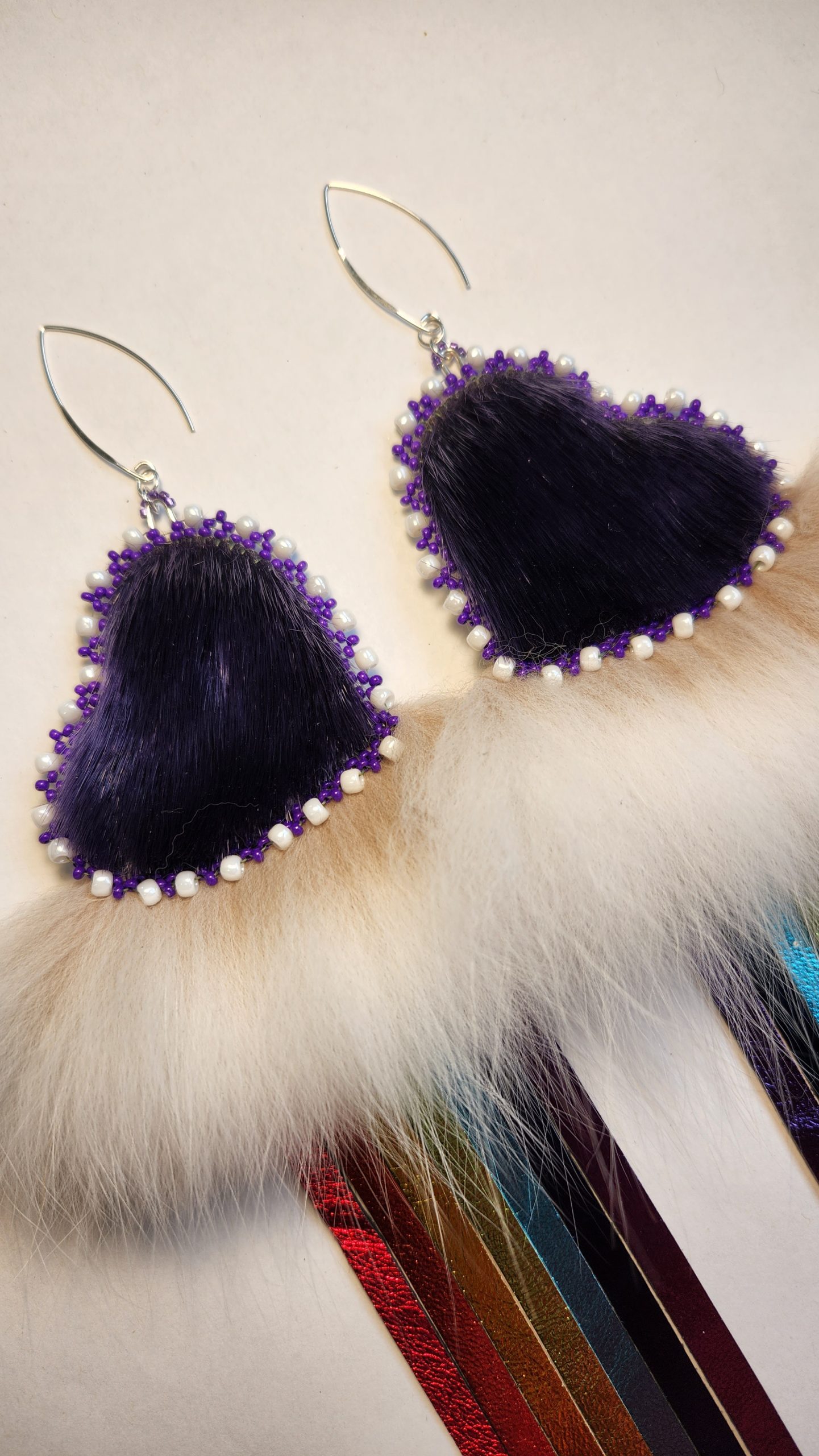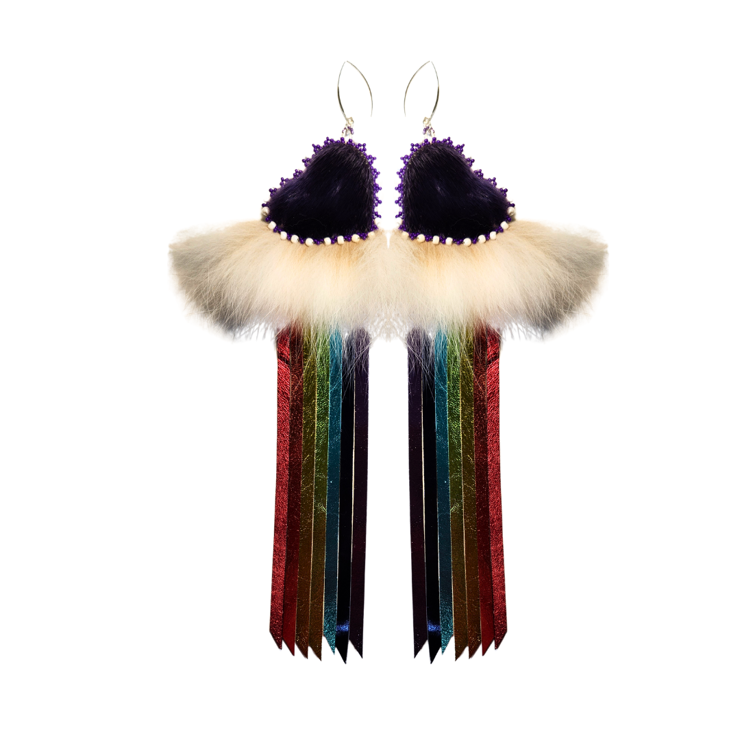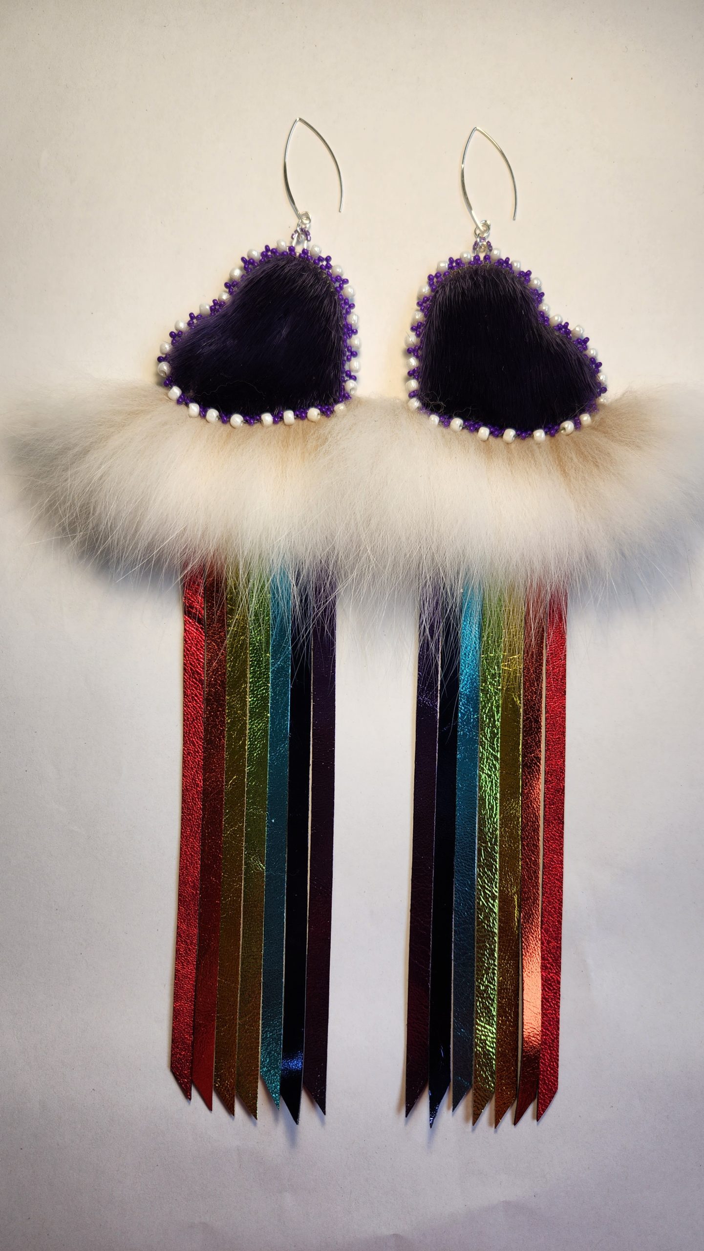 Découvrez ces superbes boucles d’oreilles à franges arc-en-ciel et cœur en peau de phoque d’un mauve éclatant. Avec leurs deux faces en peau de phoque, les cœurs constituent l’élément phare de ces boucles d’oreilles, qui présentent des franges éclatantes aux couleurs de l’arc-en-ciel fabriquées en cuir d’agneau métallique et fixées aux cœurs, dévoilant ainsi une fascinante cascade de couleurs. De la fourrure de renard polaire a été délicatement ajoutée entre les franges arc-en-ciel et les cœurs pour former un nuage duveteux. Procurez-vous une paire et démarquez-vous grâce à ces superbes boucles d’oreilles légères aux couleurs de l’arc-en-ciel.